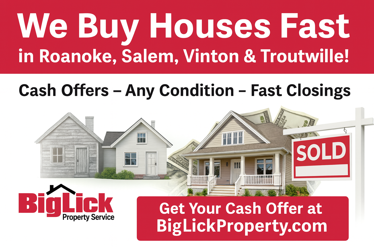 Looking to sell your house fast in Roanoke VA? At BigLickProperty.com, we are trusted cash home buyers in Roanoke, Salem, Vinton, Troutville, and the surrounding areas. We buy houses in any condition, in any situation, and we pay fast cash for homes so you can move on without delays.